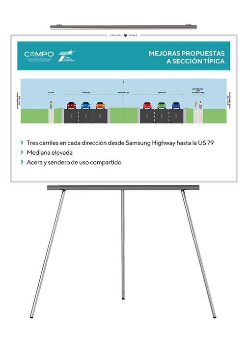 Haga clic en las flechas azules a cada lado de la exhibición de la reunión para ver las exhibiciones de la reunión. Haga clic en cada exhibición para revisar la información del proyecto y escuchar una grabación de voz en inglés, o haga clic en el botón a la derecha que dice "Español" para revisar la información del proyecto en español.